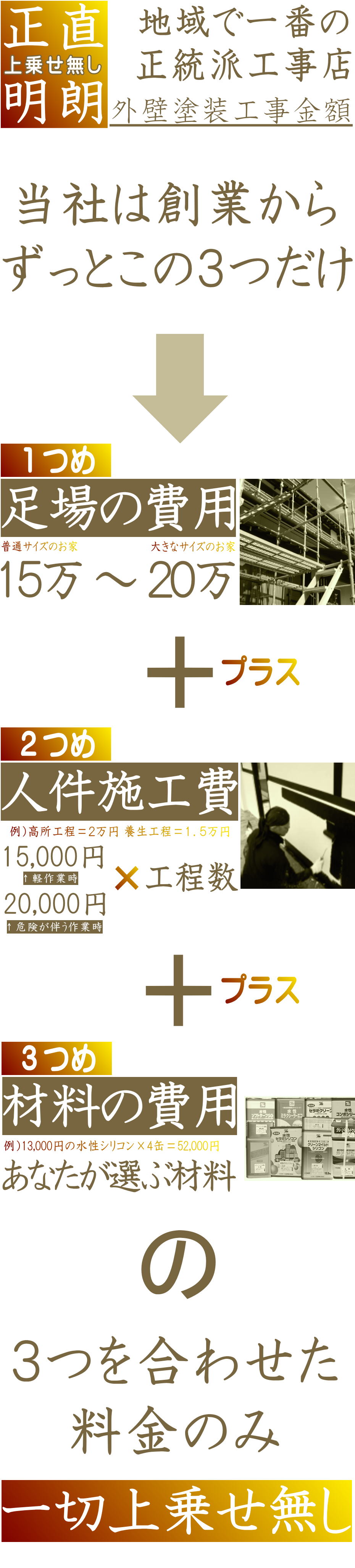 工事は『足場代』+『材料代』+『人件費』だけ!それ以上の上乗せ儲けは絶対に計上しない!それが当社の経営方針です。
